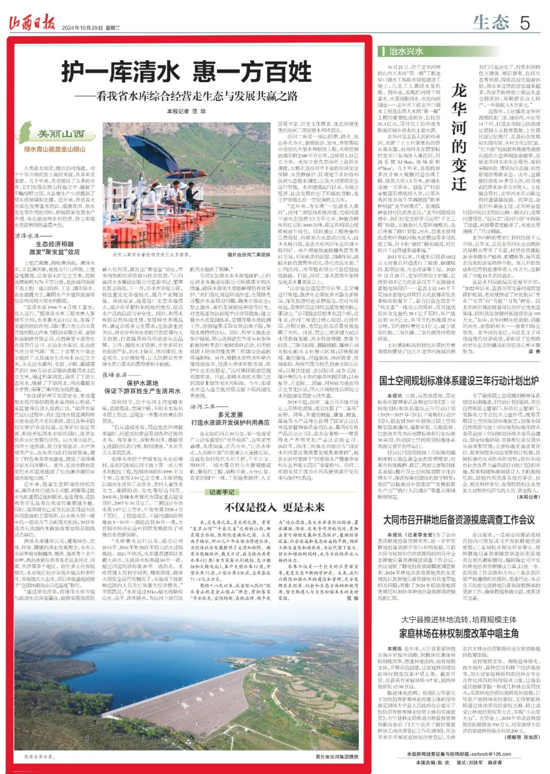 為切實加強水庫水源地保護,山西沁河水務集團有限公司積極落實相關措施,確保水源地水質能夠得到有效保護。“我們強化周邊環境治理,全面排查并整治水庫周邊問題,確保水質安全;禁止游泳、垂釣及傾倒廢棄物等行為,對違規者依法依規予以勸導疏離;建立健全水質監測體系,定期開展水質檢測工作,依據結果采取有效治理手段,保障水質持續達標。同時,科學實施生態保護措施,精心選擇適宜當地生長條件的植物種類進行植樹造林活動,利用植被固土防蝕功能改善工程建設造成的環境影響。另外,根據水庫特點科學合理投放魚苗,促進生物多樣性發展,維護生態系統穩定。”沁河集團副總經理劉建軍說。目前,張峰水庫的水質已達到國家Ⅱ級飲用水的標準。今年,張峰水庫還入選首批省級美麗幸福河湖優秀案例。
