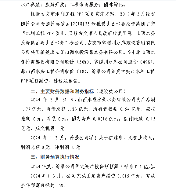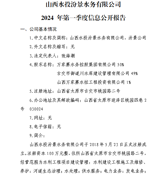 山西水務集團建設投資有限公司2024年第一季度信息...