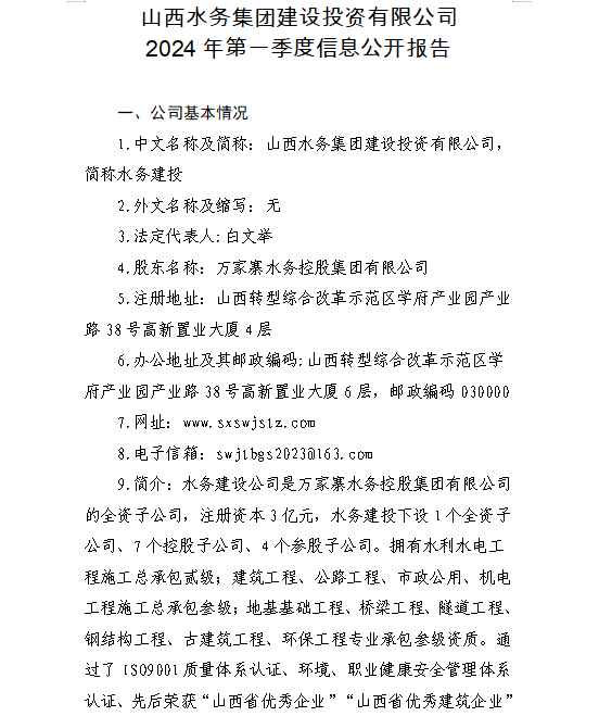 山西水投汾景水務(wù)有限公司2024年第一季度信息公開...