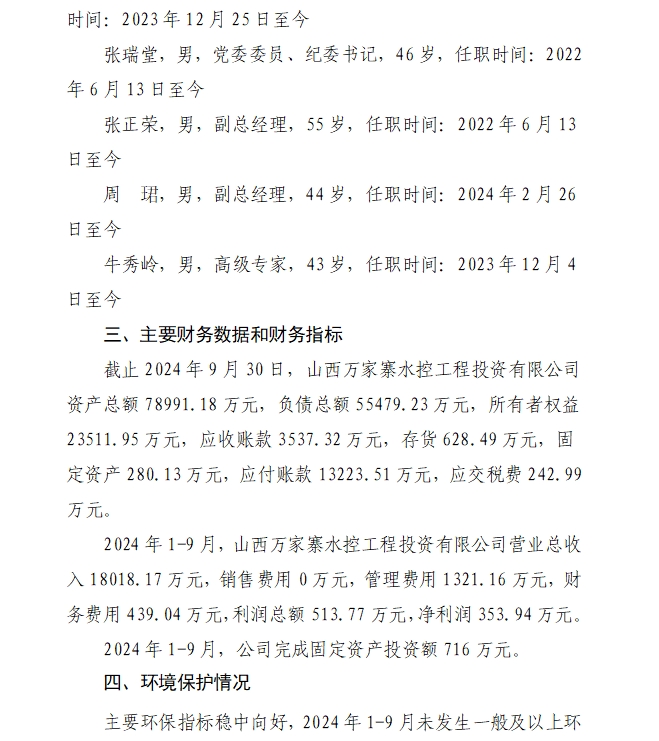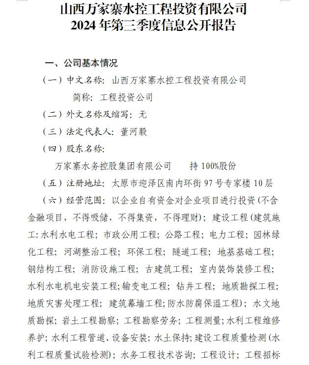 山西萬家寨引黃水務(wù)集團(tuán)有限公司2024年第三季度信...