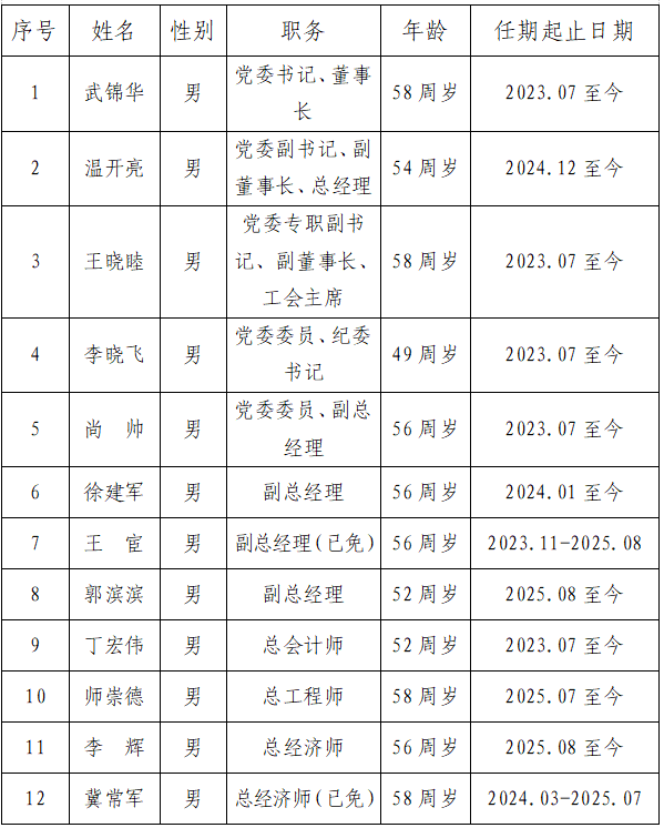 2.領導班子成員:黨委書記、董事長1名;黨委副書記、副董事長、總經理1名;黨委專職副書記、副董事長、工會主席1名;黨委委員、紀委書記1名;黨委委員、副總經理1名;副總經理2名;總會計師1名;總工程師1名;總經濟師1名。